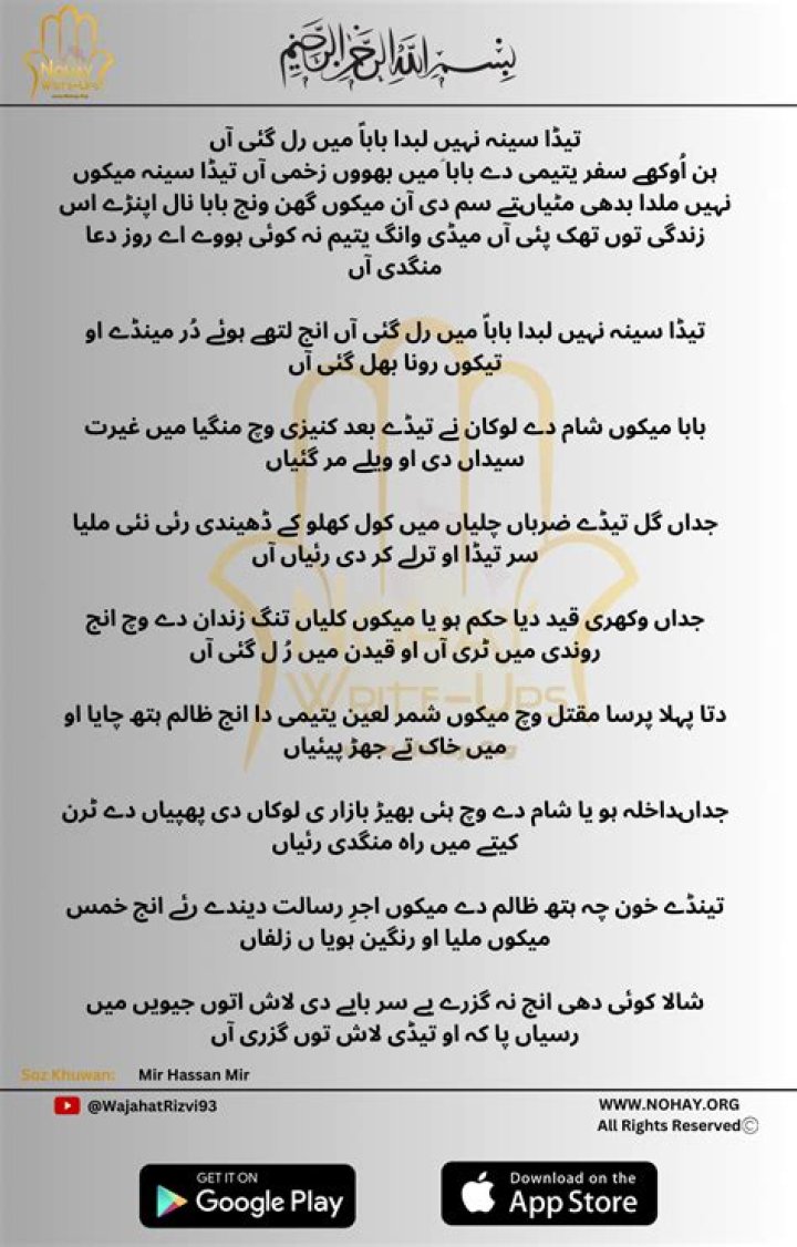 Lyrics and Translation Tera Seena Nahi Labda Mir Hassan Mir Last update on: December 14, 2017 Restricted Lyrics Unfortunately we're not authorized to show these lyrics. Musixmatch for Spotify and Apple Music is now available for your computer Download nowArijit Singh & Shreya Ghoshal - Samjhawan Lyrics