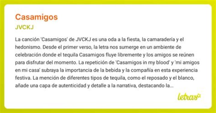 In conclusion, “CASAMIGOS” by JVCKJ is more than just a catchy party anthem. It embodies the spirit of friendship, unity, and embracing the moment. It encourages us to let go of inhibitions, enjoy the company of friends, and create lasting memories. The lyrics spark a sense of adventure and rebellion against societal norms. This song has undoubtedly become a favorite among many, including myself, because it captures the essence of joyful moments shared with loved ones.