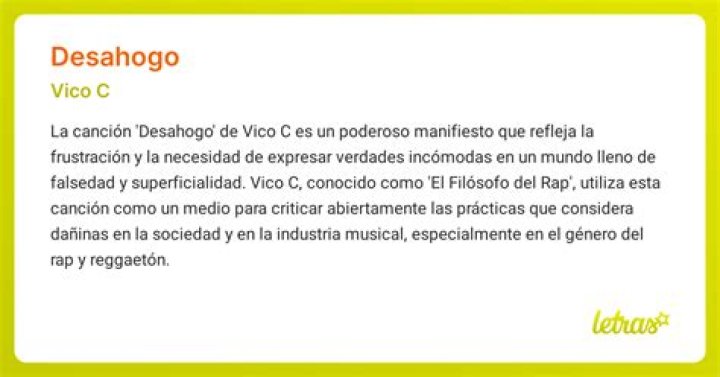 Desahogo is a popular song by Vico C, a renowned Puerto Rican rapper and songwriter. Released in 1996, the song quickly gained recognition for its powerful lyrics and emotional depth. The word “desahogo” translates to “release” or “ventilation” in English, and it perfectly encapsulates the essence of the song.