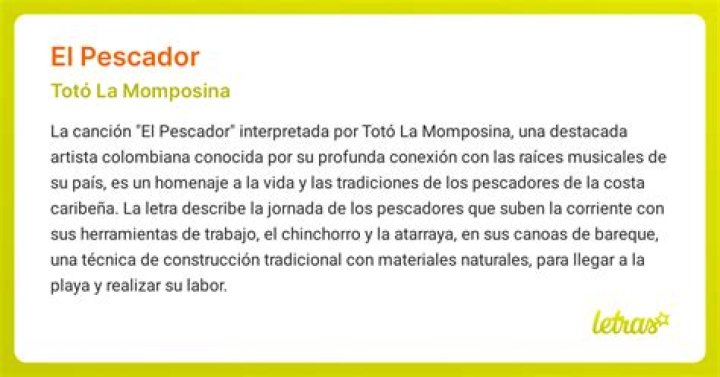 “El Pescador” captures the essence of the lives of fishermen as they navigate their way through the river, relying solely on their fishing nets and the natural elements surrounding them. The opening verses depict their journey upstream using traditional fishing gear, such as the “chinchorro” (a type of fishing net) and the “atarraya” (a cast net), in order to reach the beach where they can carry out their work.