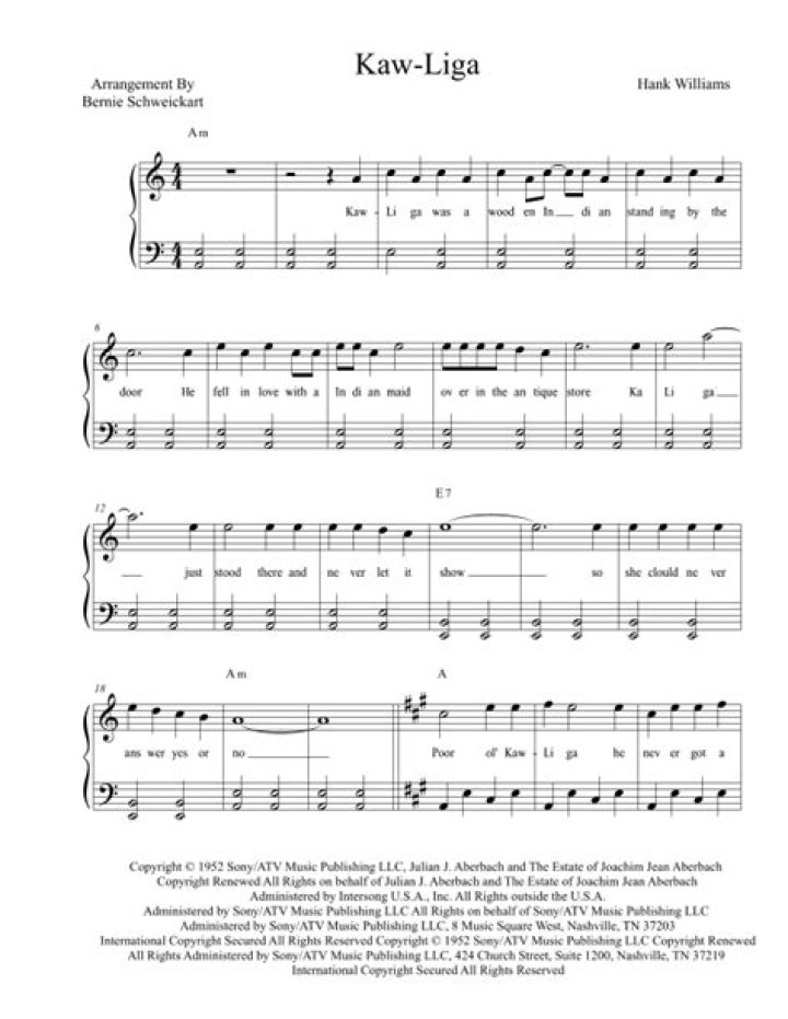 Kaw-Liga is a classic country song written by Hank Williams and Fred Rose. It was recorded by Charley Pride in 1969 and became one of his signature songs. The song tells the story of a wooden Indian statue that stands outside a store, representing an unrequited love. The lyrics of Kaw-Liga convey themes of heartbreak, loneliness, and unfulfilled affection in a melancholic and poignant manner.