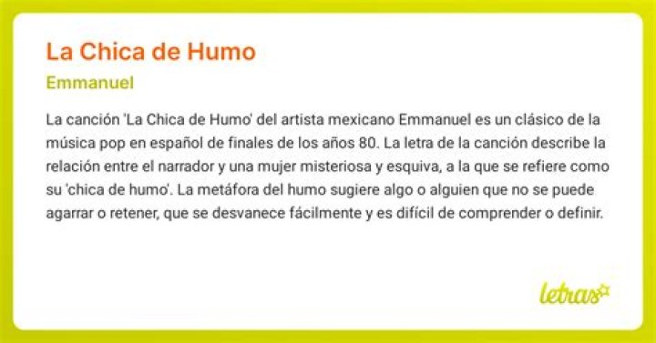 La Chica De Humo, which translates to “The Girl of Smoke,” is a famous Spanish song by Emmanuel. Released in 1983 as part of his album “En La Soledad,” this song captured the hearts of millions and became one of Emmanuel’s biggest hits. With its captivating melody and poetic lyrics, La Chica De Humo continues to resonate with listeners worldwide.