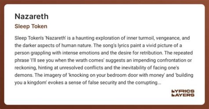In conclusion, the meaning behind “Nazareth” by Sleep Token is open to interpretation, yet it carries universal themes of self-discovery, spiritual awakening, and finding beauty in unexpected places. Whether you relate to the lyrics on a personal level or appreciate the artistic expression Sleep Token provides, this song serves as a beacon of comfort and understanding to many listeners, including myself. So, let the mesmerizing melodies of “Nazareth” wash over you, embrace the emotions it evokes, and allow it to guide you on your own journey of self-discovery.