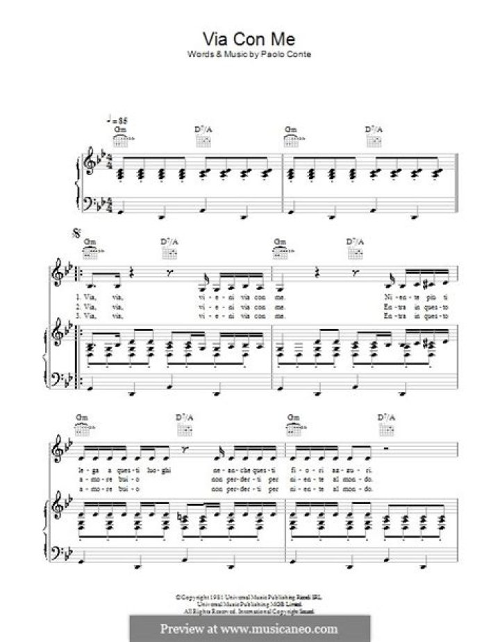Over the years, Via con Me has been covered by various artists, showcasing its enduring popularity. Notable covers include versions by Italian singer Mina, French artist Serge Gainsbourg, and American jazz vocalist Melody Gardot.