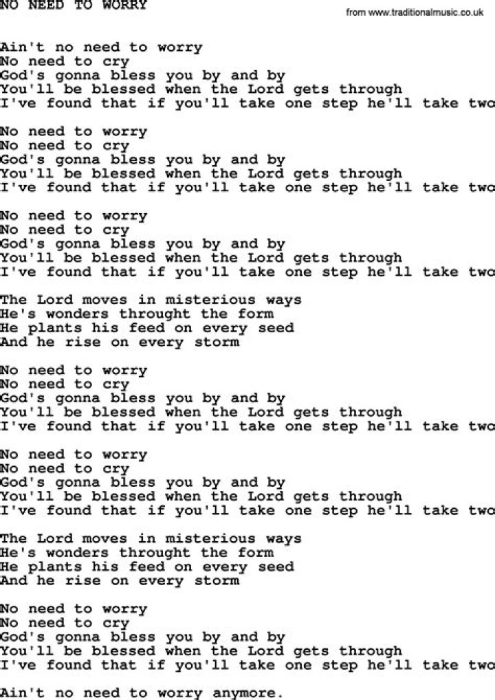 No Need To Worry lyrics by Folk Implosion: ... But there's no need to worry Confusion had it's own embrace Your mind loves to worry Your heart plans it's own escapeAl Green - God Is Standing By Lyrics