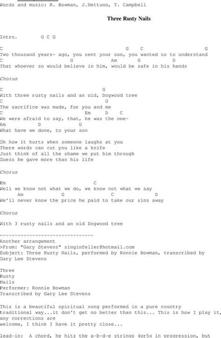 Ronnie Bowman - Three Rusty Nails Lyrics | Musixmatch Lyrics Three Rusty Nails Ronnie Bowman Lyrics not available. Be the first to add the lyrics and earn points Add lyrics Powered by AI Curated by people Start your discoveryIVAN ABRAHAM - THREE RUSTY NAILS ALBUM LYRICS