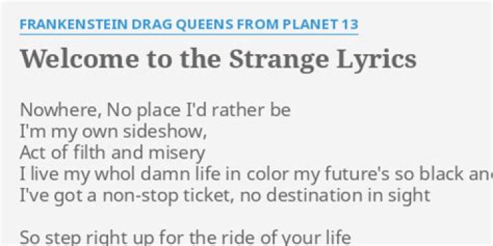 Lyrics to 'Welcome To The Strange' by The Frankenstein Drag Queens From Planet 13. Nowhere..... / No place I'd rather be, / I'm my own sideshow / wrapped in.Welcome to the strange Lyrics