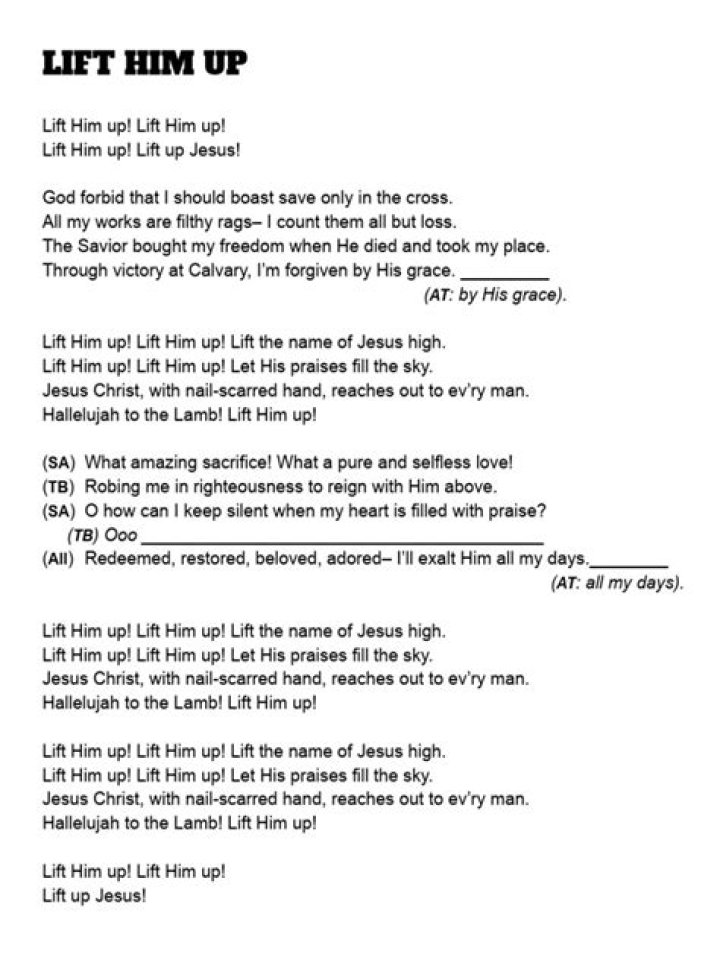We've come to lift our hands We've come to clap our hands We've come to do our dance And give Him praise Halle lujah Alto and choir echoes (repeat and modulate x3) (Everyone) Halle lujah x4 Music Interlude (Everyone)New Direction - Worship Christ Lyrics