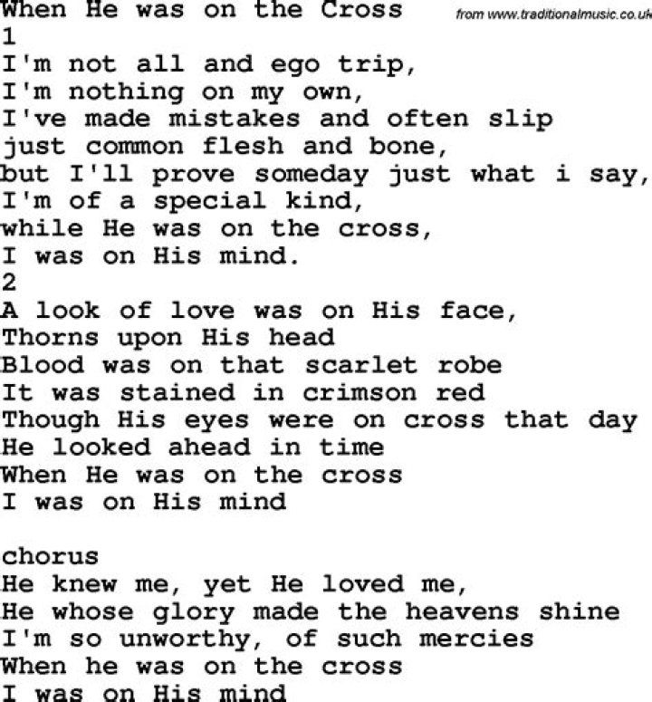 He looked ahead in time For while He was on the cross, You were on His mind Chorus: He knew me, yet He loved me He whose glory makes the heavens shine I'm so unworthy of such mercy For while He was on the cross I was on His mind Yes, while He was on the cross You were on His mind He knew me, yet He loved me He whose glory makes the heavens shineSUE DODGE - WHEN HE WAS ON THE CROSS (I WAS ON HIS MIND ...