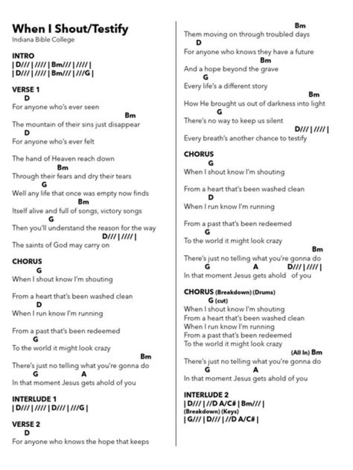 Indiana Bible College - When I Shout/Testify Lyrics