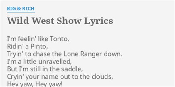 Lyrics for Wild West Show by Big & Rich. I'm feeling like Tonto Riding a pinto Trying to chase the Lone Ranger down I'm a little unraveled But I'm still in the s...Wild West Show Lyrics - Big & Rich