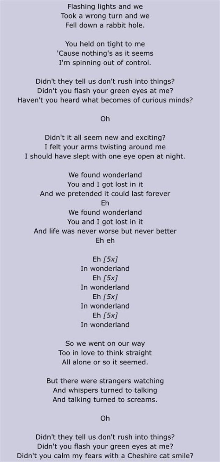 The Lyrics for Wonderland by Taylor Swift have been translated into 34 languages Flashing lights and we Took a wrong turn and we Fell down a rabbit hole You held on tight to me 'Cause nothing's as it seems And spinning out of control Didn't they tell us "Don't rush into things"?Taylor Swift - Clean Lyrics