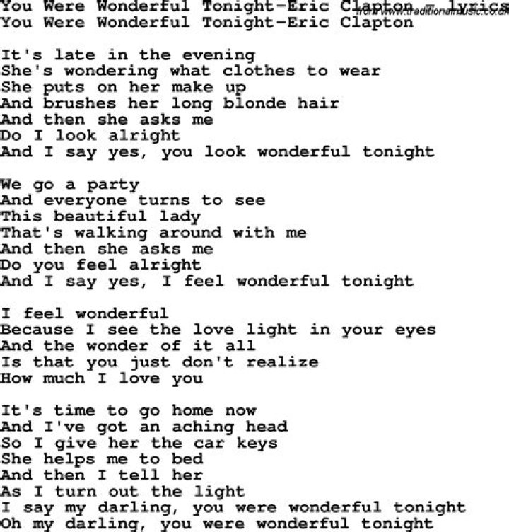 And I say, yes, you look wonderful tonight. ... This beautiful lady that's walking around with me And then she asks me, do you feel all right? And I say, ...Eric Clapton Lyrics - Wonderful Tonight