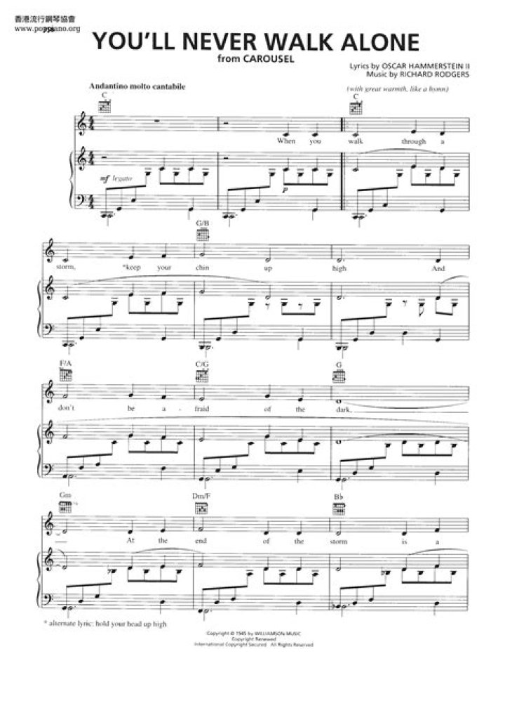 When you walk through a storm Hold your head up high And don't be afraid of the dark. At the end of the storm Is a golden sky And the sweet silver song of a lark. Walk on through the wind Walk on through the rain Though your dreams be tossed and blown. Walk on walk on with hope in your heart And you'll never walk alone. You'll never walk aloneYou`ll Never Walk Alone (from `Carousel`) - Rodgers ...
